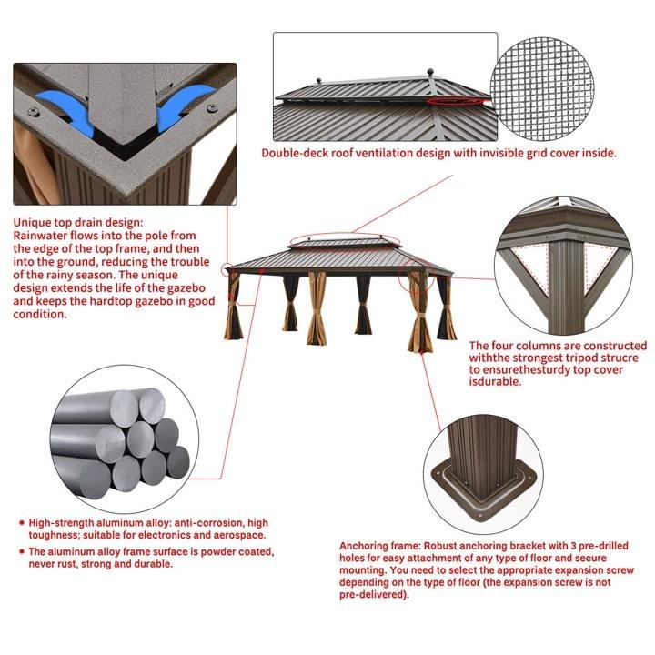 - ▽RUSTPROOF ALUMINUM FRAME▼Sturdy powder-coated rust-resistant hardtop frame make the gazebo very stable & sturdy. All materials are built to last, never becoming rusty or deformed.