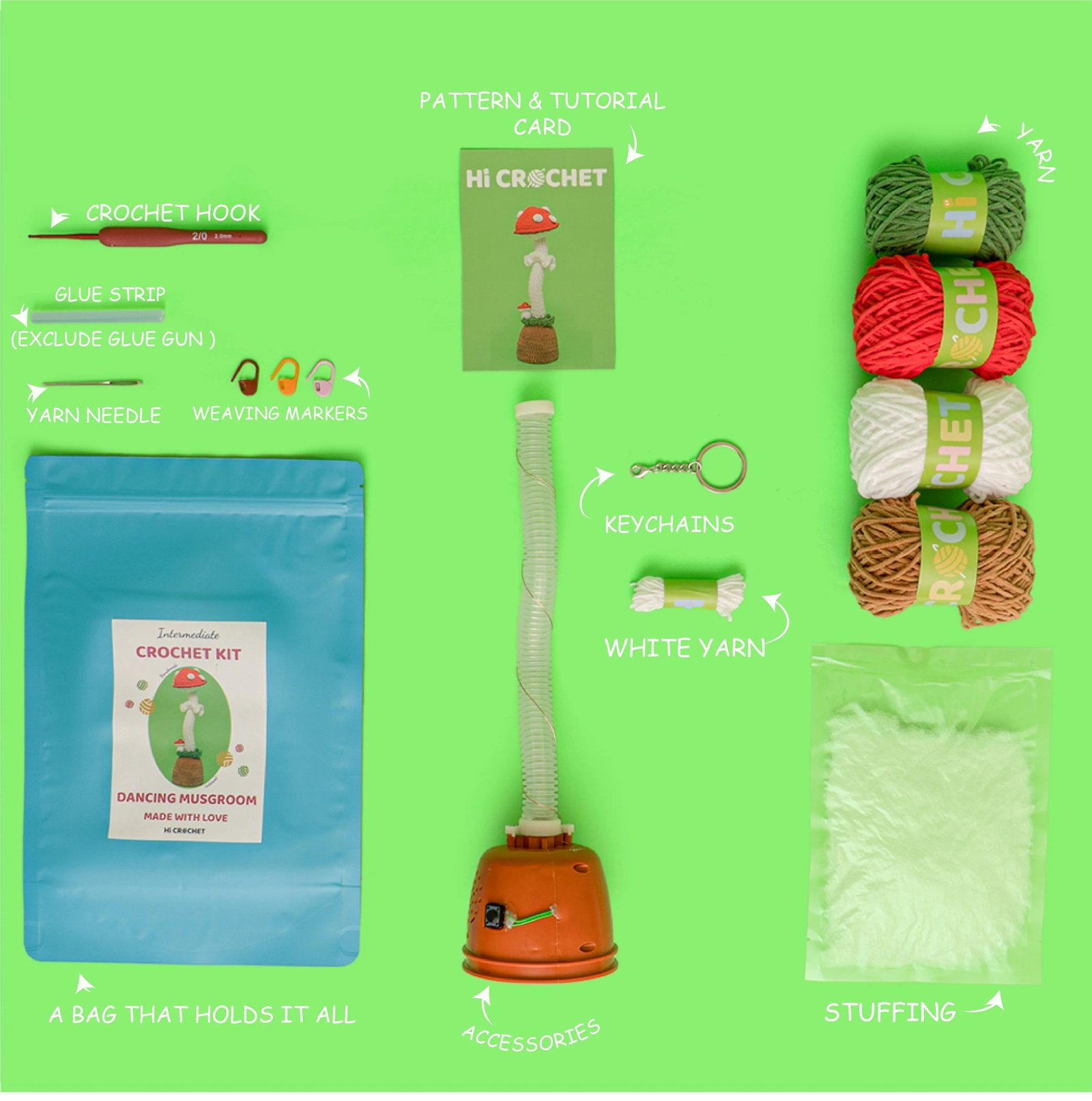 Now, this magical crochet kit is in your hands. Let’s embark on this enchanting crochet journey together and create our own charming mushrooms! May its singing and dancing bring you endless joy and wonder!