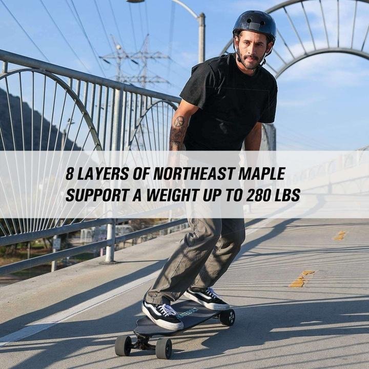 - Durable and Stable – This longboard is made with 8 layers of northeast maple which make it sturdier to support a weight up to 280 lbs. The wheels (90 mm) and the deck (38*9.4*5.5 in) are wider for a smooth and stable skateboarding.