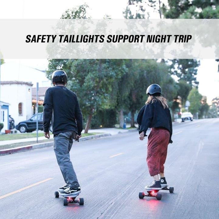 - Taillights for Safety – The powered skateboard is equipped with 2 red warning taillights. To ensure a safe riding in the dark street. They will keep blinking to warn any vehicles coming behind you when you hold the brake.
