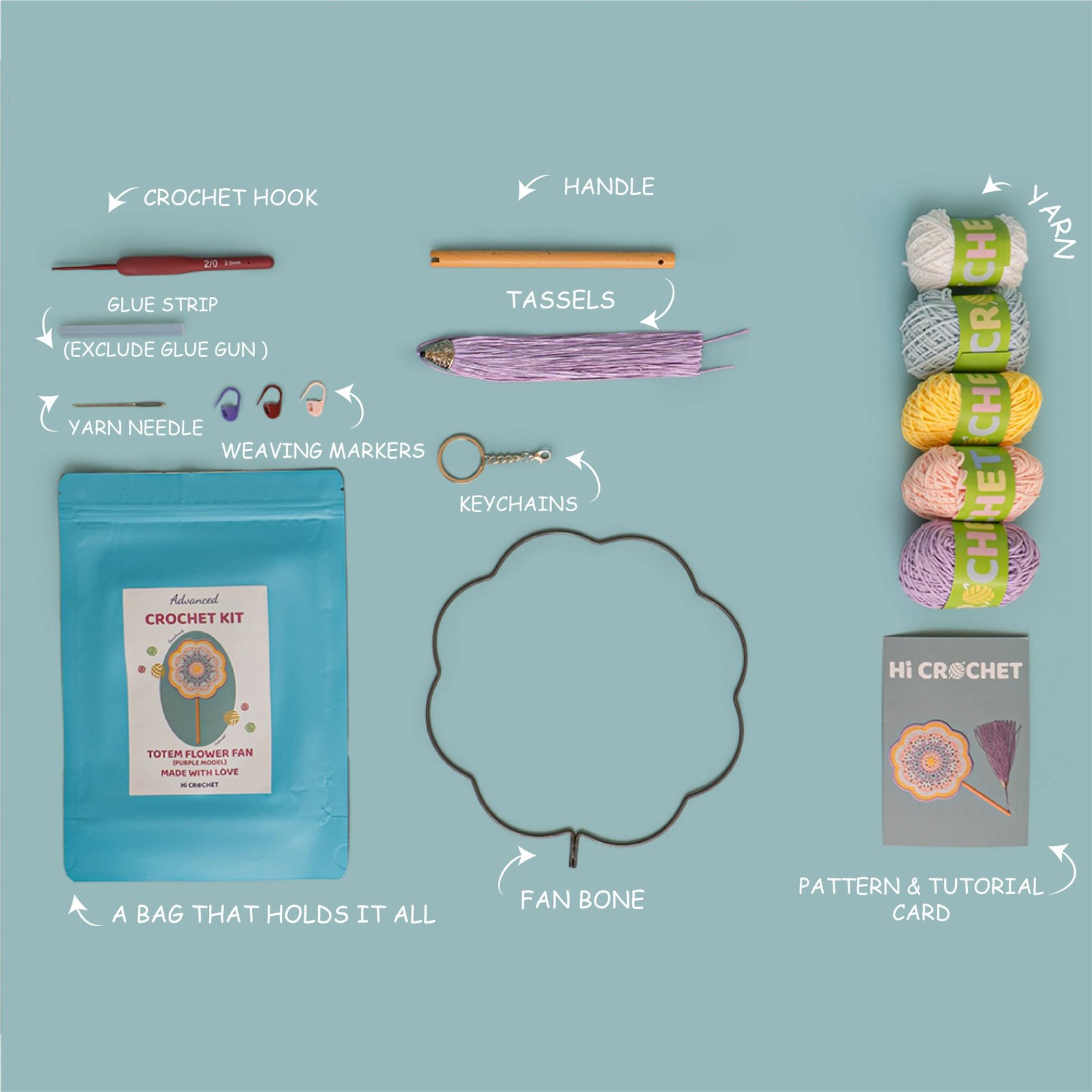 The kit includes high-quality crochet hooks , vibrant Styleed yarns , fan ribs, decorative accessories , as well as detailed written instructions and video tutorials , ensuring you have everything you need for the project without additional purchases. Even those with some crochet experience can smoothly complete it with step-by-step guidance, enjoying the fun of crafting.